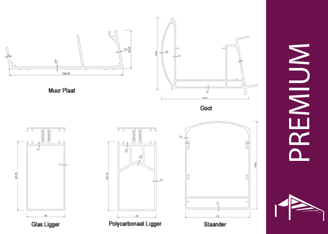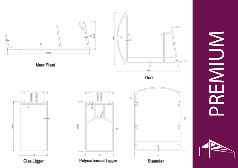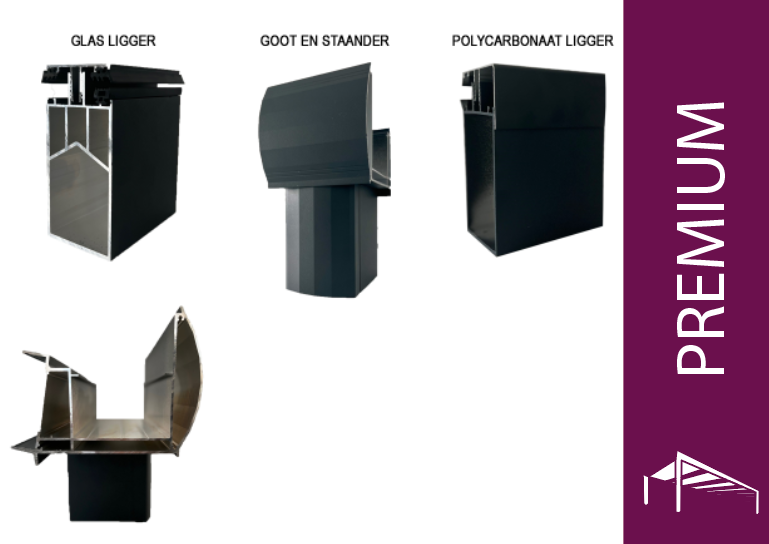 Ons Premium model is ons beste model, hij is gemaakt van extra dik 2,5 millimeter aluminium en een dubbele laag in de goot wat hem nog steviger maakt. Ons Premium model is bestand tegen de zwaarste weersomstandigheden over de hele wereld! Ons Premium model kan een polycarbonaat dak dragen van vrijwel alle dieptes en een glazen dak van maximaal 4 meter. Net als ons Optimum model word hij geleverd met alle bijbehorende accessoires zoals rubbers, schroeven, en eventueel LED verlichting.